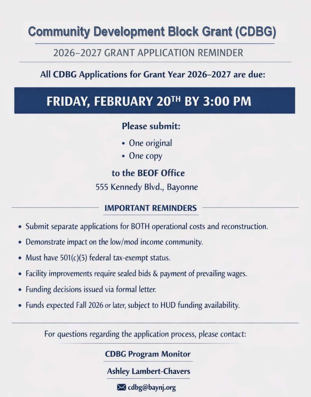 This is a friendly reminder that all CDBG applications for the 2026–2027 grant year are due Friday, February 20th by 3:00 PM.